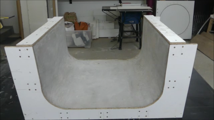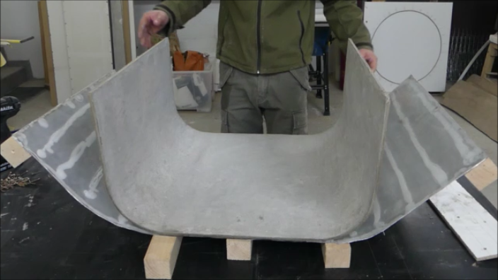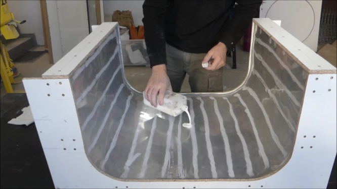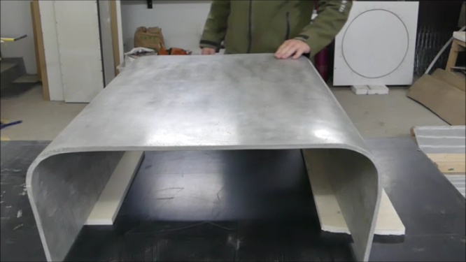 Für diesen Betontisch muss eine Negativ-Schalungsform hergestellt werden. Der Beton wird hier nicht gegossen, sondern in einem sog. Laminierverfahren Schicht für Schicht in die Form eingebracht.