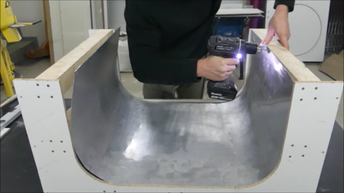 Das Blech habe ich an den beiden Enden jeweils mit drei Schrauben fixiert, so dass dieses nicht mehr verrutschen kann. Die Löcher im Blech musst du mit einem Senker nachbearbeiten, so dass die Schraubenköpfe bündig mit dem Blech abschließen. Sollten die Schraubenköpfe überstehen, werden sich diese später als Eindellungen auf dem Sichtbeton abzeichnen.